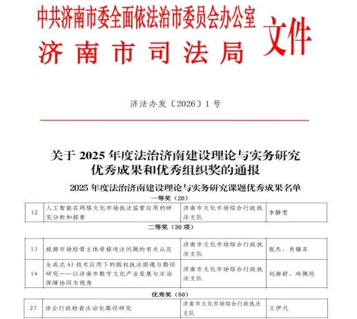 近日,中共济南市委全面依法治市委员会办公室、济南市司法局通报“2025年度法治济南建设理论与实务研究优秀成果”,市文化执法支队4篇调研报告榜上有名。
